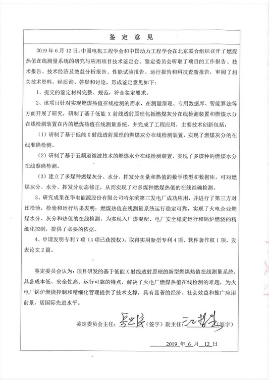 2019年6月12日,中國(guó)電機(jī)工程學(xué)會(huì)和中國(guó)動(dòng)力工程學(xué)會(huì)在北京聯(lián)合組織召開了燃煤熱值在線測(cè)量系統(tǒng)的研究與應(yīng)用項(xiàng)目技術(shù)鑒定會(huì)。